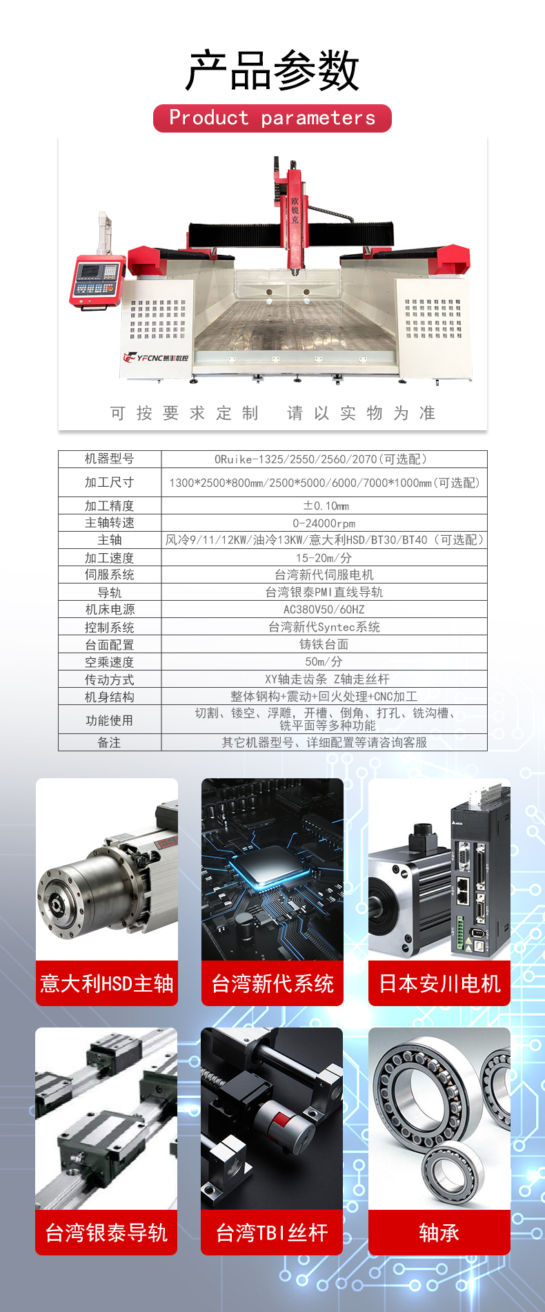 設(shè)備型號:2560 X*Y行程:2500*6000mm 傳動方式:XY軸進口斜齒條,Z軸滾珠絲杠,三軸 驅(qū)動電機:臺灣新代伺服電機 控制系統(tǒng):新代系統(tǒng) 主 軸:9KW BT30 BT40主軸 進給速度:0--60m/min 加工速度:10--15m/min 臺面固定:鋼板臺面 對接軟件:對接軟件:PM、WORKNC、UG等 電壓:AC380V50/60HZ